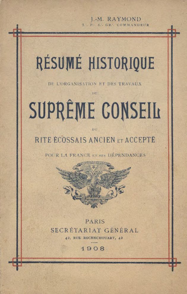 Comme le rappelle fort justement le Grand Commandeur du Suprême Conseil de France Jean-Marie RAYMOND (1845-1914) dans son « Résumé historique de l'organisation et des travaux du Suprême Conseil du Rite Écossais Ancien et Accepté pour la France et ses dépendances », publié en 1908 :