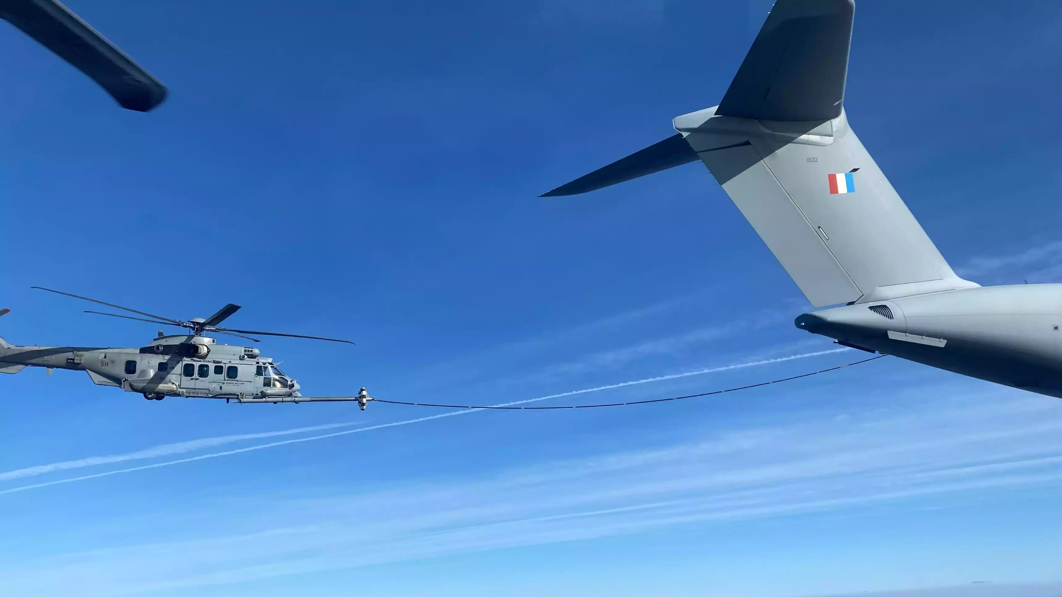 Premier ravitaillement en vol d'un Caracal de l'EH 1/67 Pyrénées par un A400M Atlas (ET 3/61 Poitou) de l'Armée de l'Air et de l'Espace (5 février 2025). © AAE