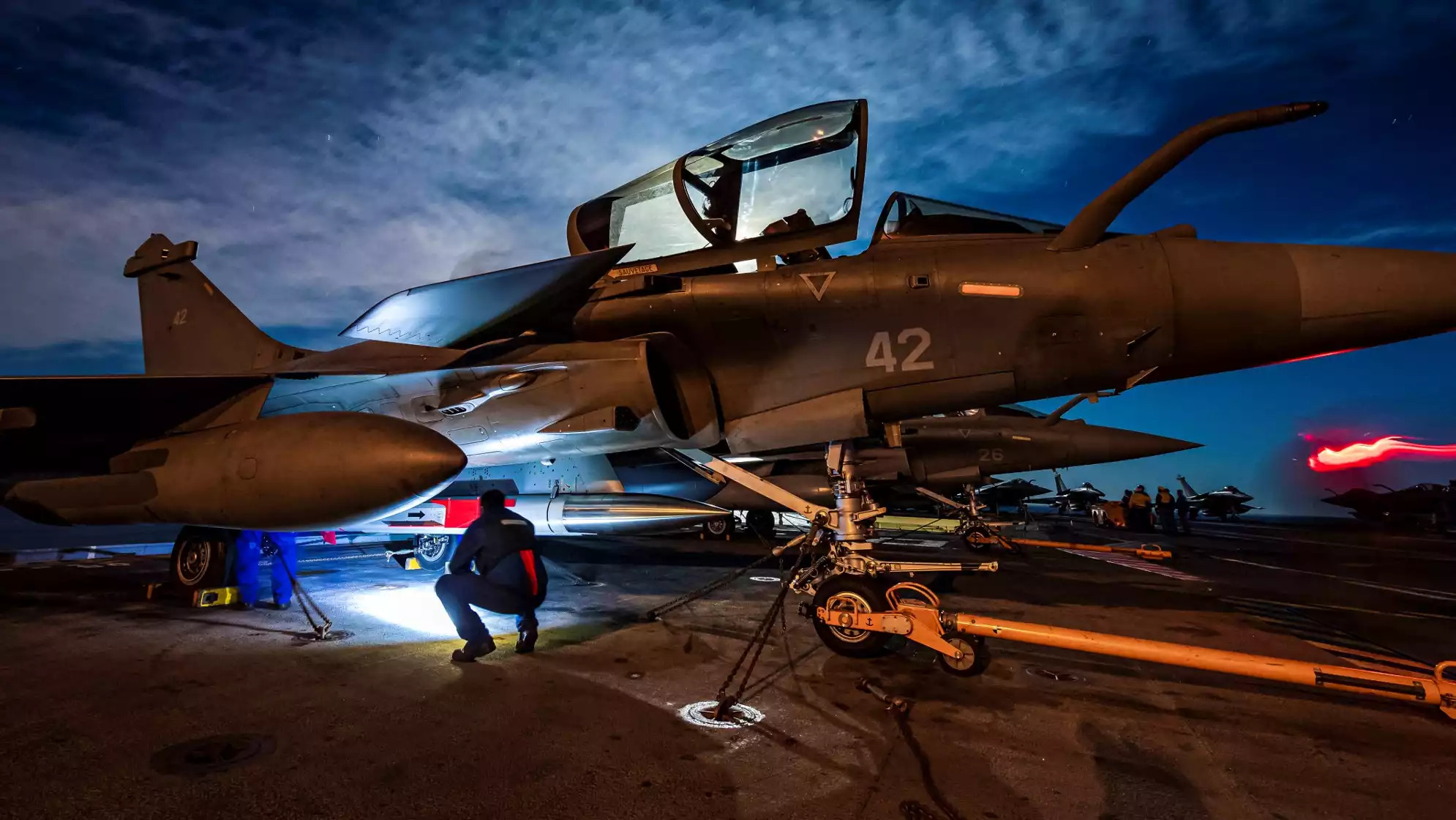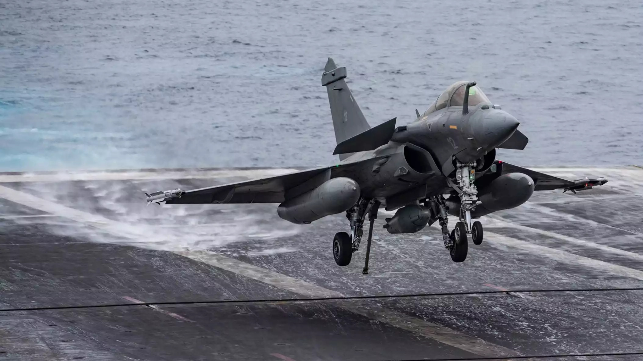 Avion de combat Rafale M équipé d'un missile de croisière à ogive nucléaire ASMPA sur le pont du porte-avions Charles de Gaulle. © Marine nationale