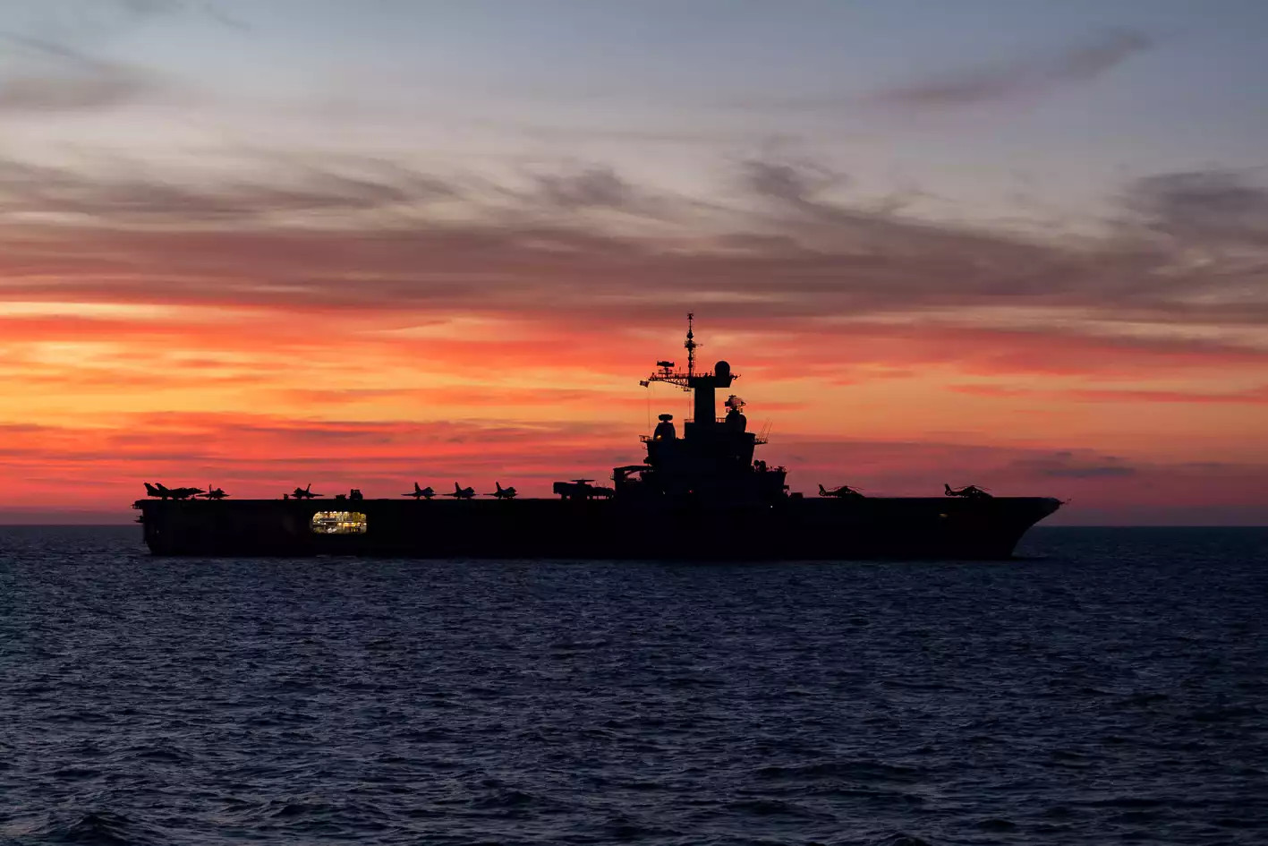 Porte-avions Charles de Gaulle devant un coucher de soleil. © Marine nationale (Romuald Le Hénaff)